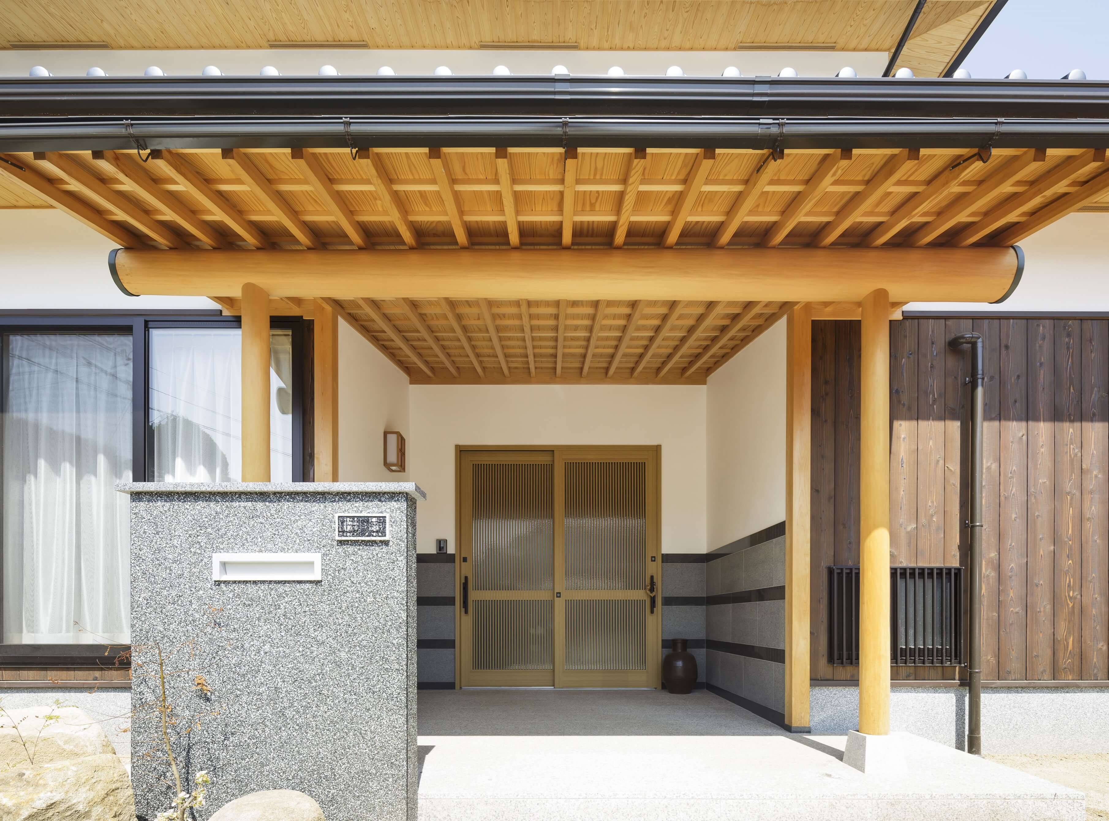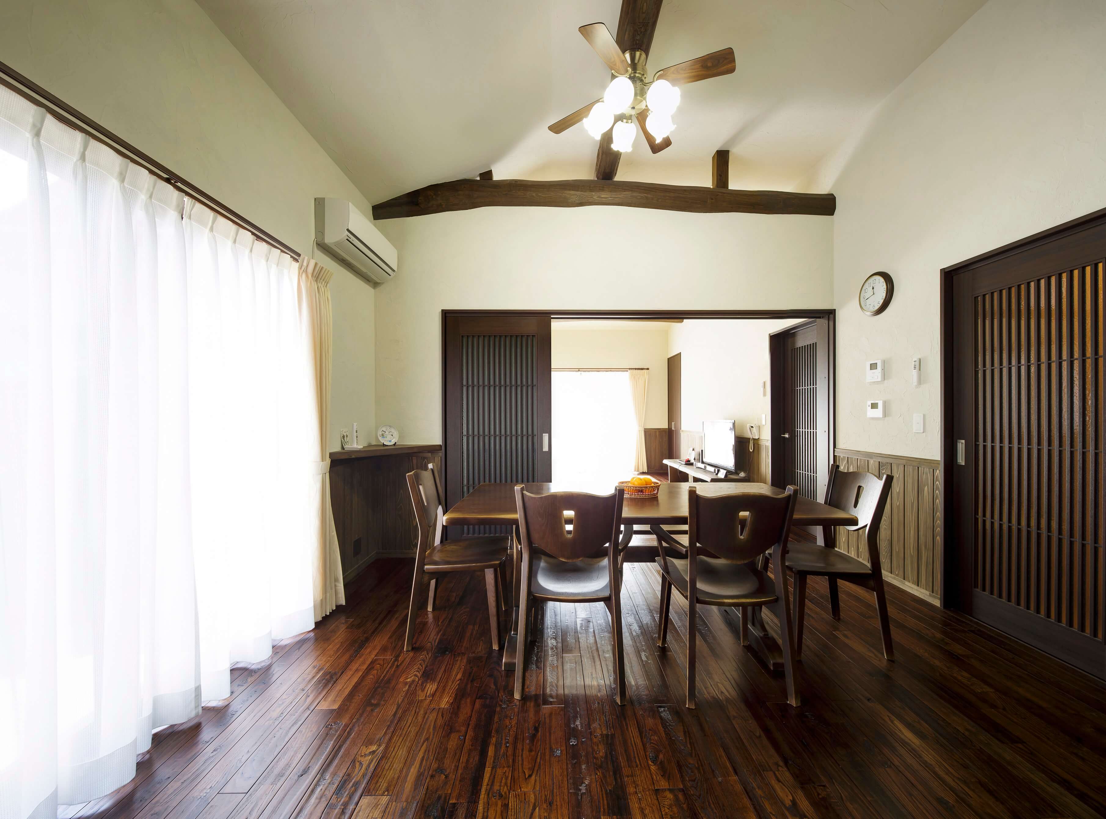 昔ながらの日本の素材にこだわり、玄関はサクラ、ダイニングはクリ、天井はヒノキを使用。
