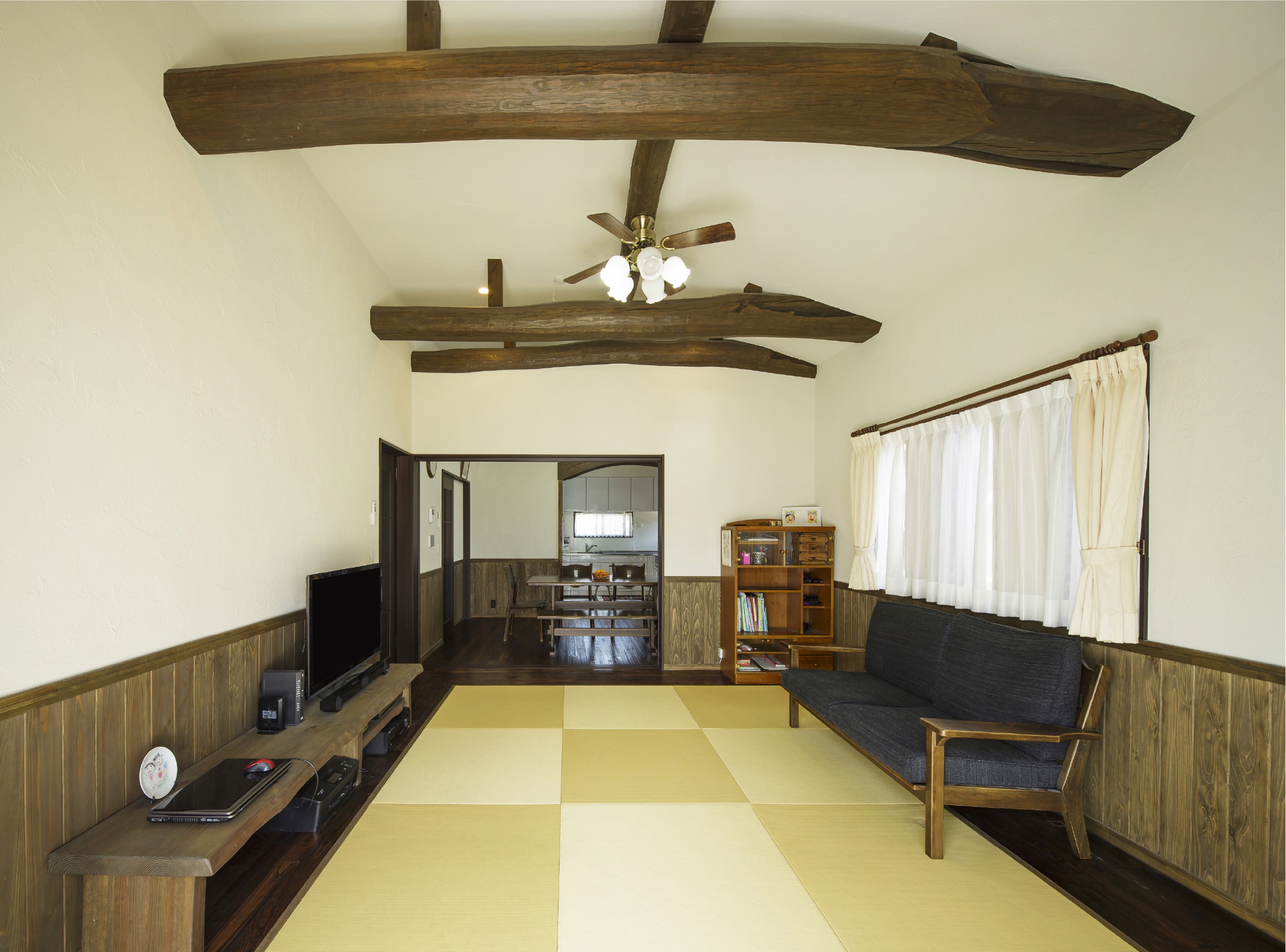 リビングの天井にわたる太い梁は元の家に使われていたものを、丁寧に解体して再生しました。